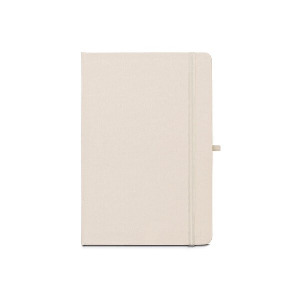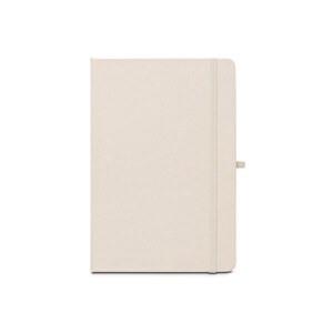 A5 notebook, with a rigid cover in recycled polyester (100% rPET) 300D and rounded corners. It contains 160 lined pages in 100% recycled ivory-coloured paper, a ribbon, a pen holder (pen not included) and an elastic band for closing. The rPET symbol is printed in white at the bottom of the spine