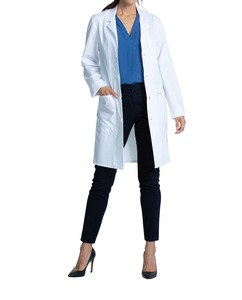 65% polyester / 35% cotton. Twill fabric. Unisex cut. Three pockets: chest pocket, two front tablet pockets. Side access slots. Elastic loop for identification badge.