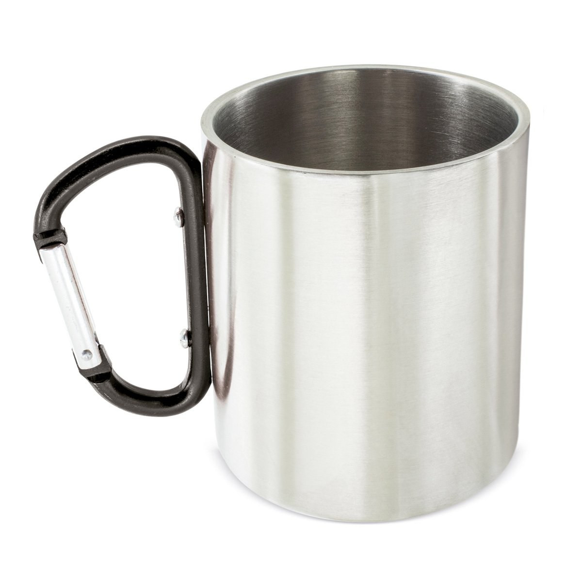 275 ml capacity stainless steel mug with shiny finish body and original carabiner handle for transportation in bright tones. Presented in an individual box.