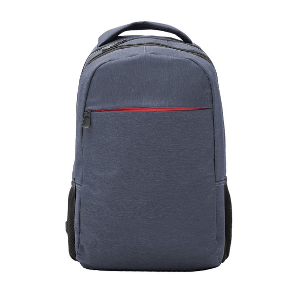 Computer backpack with melange finish. Padded shoulder straps, back panel, and handle. Double front compartment for computer, suitable for a 15'' laptop. Side pockets. Removable label.