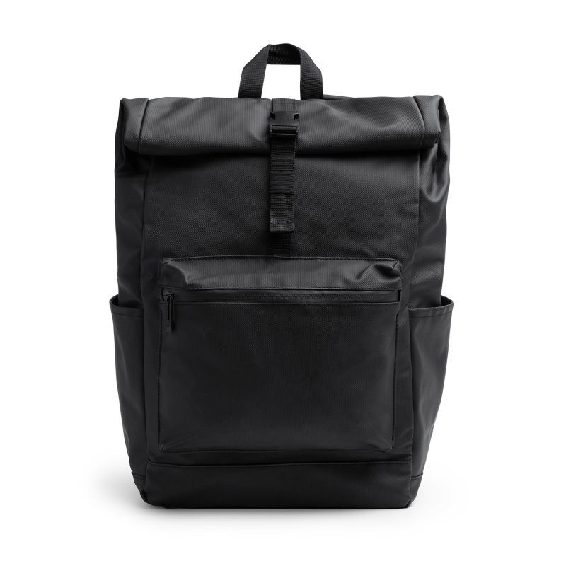 Roll-top computer backpack made of PU. Large main compartment with expandable opening and buckle closure. Padded internal computer pocket suitable for a 18" laptop. Front external pocket with waterproof zip closure. Two open side pockets. Strap for attaching it to a trolley. Adjustable padded shoulder straps. Capacity 21 liters.