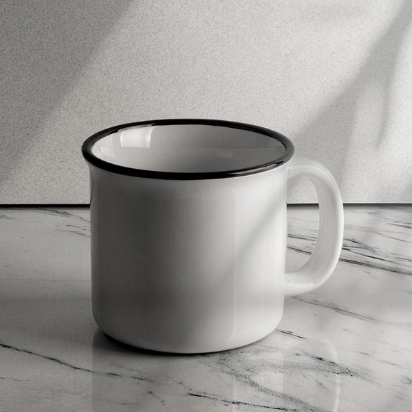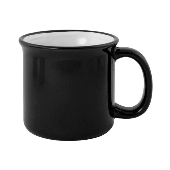 300ml ceramic mug with vintage design. In combination with outside in a wide range of tones and inside in white with black piping. Presented in an individual box.