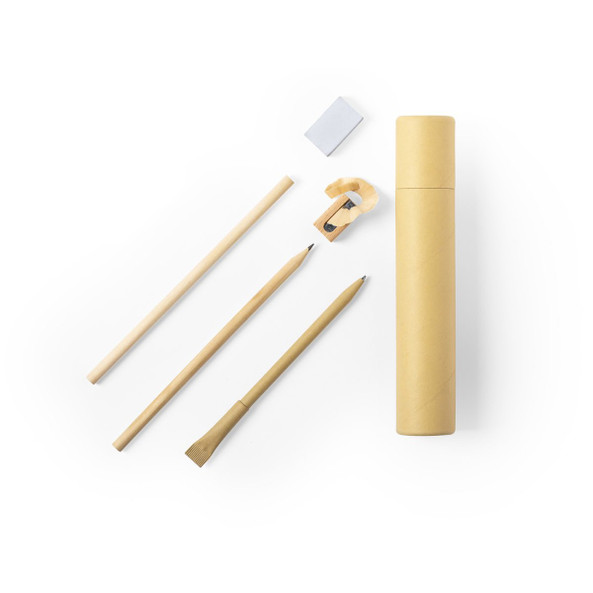 Set composed by 2 unsharpened wooden pencil, 1 cardboard ballpen with hood, sharpener and rubber. Presented in a tubular cardboard box.