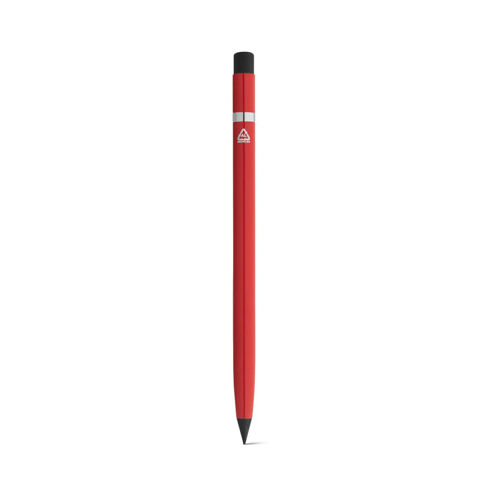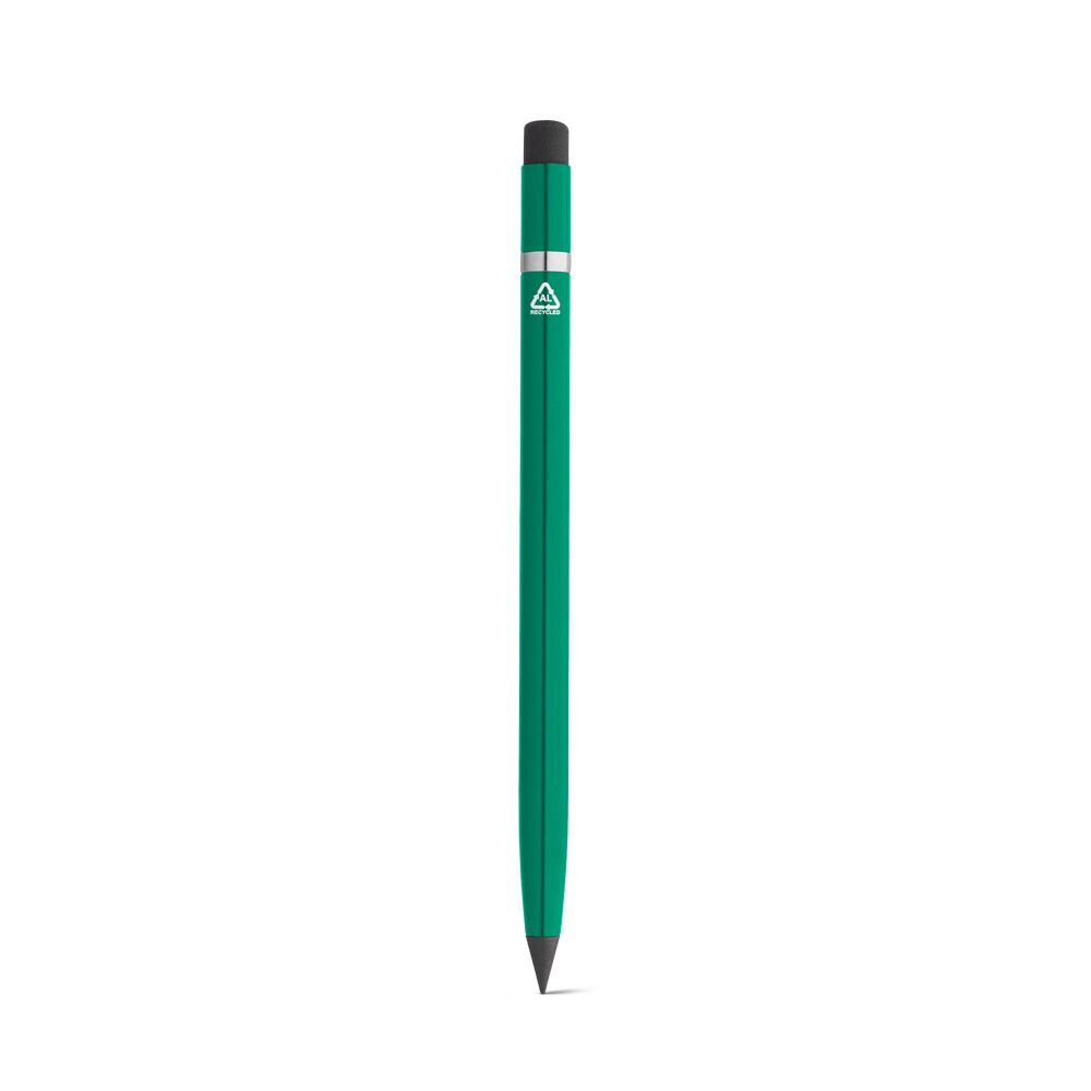 Inkless pen with recycled aluminium body (100% rAL) and recycled PE (100% recycled) with graphite tip. Suitable for long-term use without the need for sharpening. The top contains an eraser that easily erases what is written