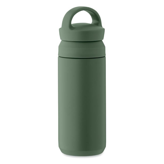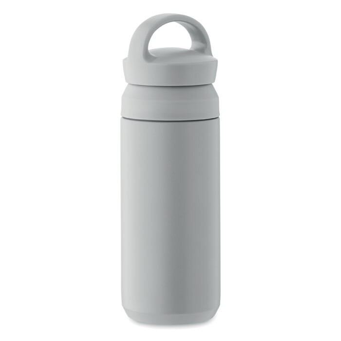 Double wall vacuum insulating bottle in recycled stainless steel (90% recycled stainless steel and 10% stainless steel) with recycled PP double lid opening for easy cleaning.