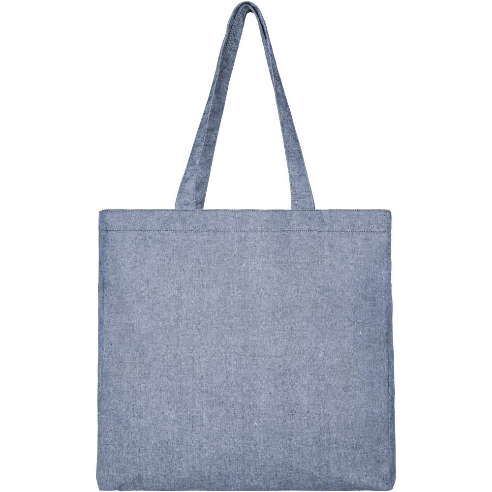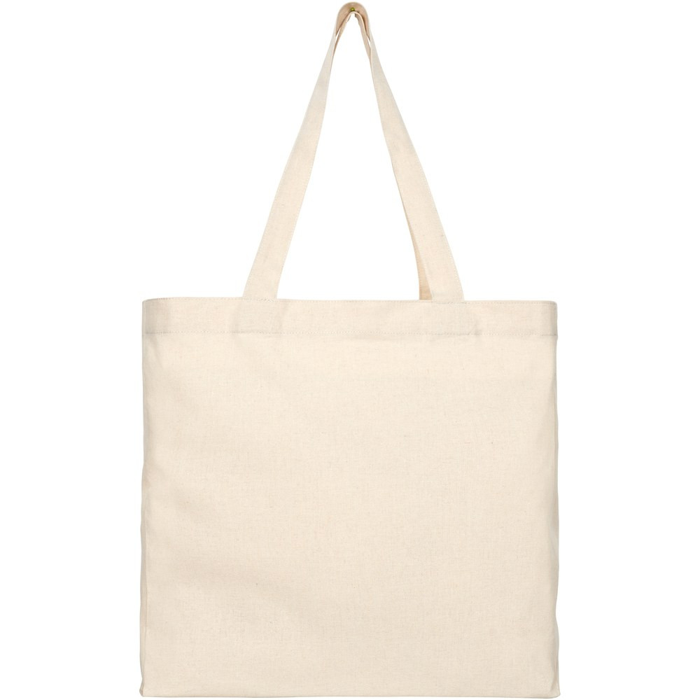 Tote made of 210 g/m² recycled cotton polyester blend. Recycled cotton is manufactured from pre-consumer waste generated by textile factories during the cutting process. Tote with gusset and large main compartment. Features two handles with a dropdown height of 31 cm. Resistance up to 10 kg weight. There may be minor variations in the colour of the actual product due to the nature of the production process