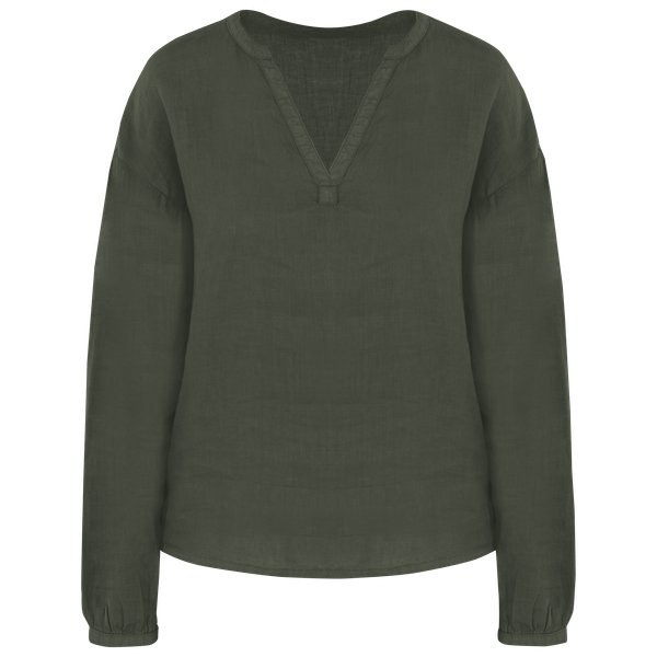 V-neck and placket with stitched bias finish and ribbed stitching.