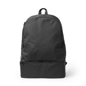 It has a side pocket in mesh fabric with elastic adjustment for carrying bottles At the bottom, it includes a rigid shoe compartment that allows belongings to be separated from the rest of the backpack.