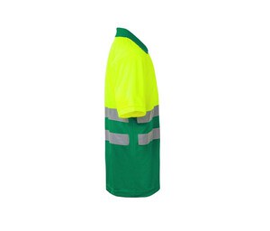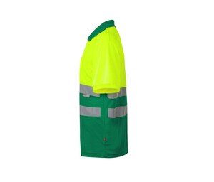 High-visibility short-sleeved polo shirt made of 100% polyester for maximum safety and breathability in work environments. This two-tone garment from Velilla combines design and protection, featuring reflective stripes on the torso to enhance worker visibility on construction sites or in low-light conditions. The collar and sleeves are ribbed for increased robustness, ensuring the garment maintains its shape through heavy use. A practical chest pocket adds utility for small tools or pens. Whether used as a blank safety essential or customized with a company logo, this polo offers a professional appearance. It is a reliable choice for bulk orders for teams requiring consistent and durable safety apparel.